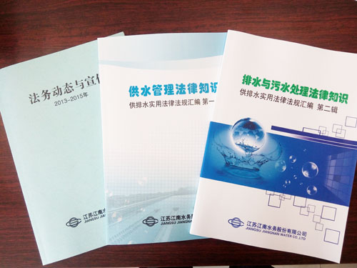 自編普法書籍,饋送一線員工。日前,公司法務部結合法律實務,著眼為各部門一線員工提供法律幫助,編撰了《供水管理法律知識》、《排水及污水處理法律知識》、《法務動態與宣傳》等法律匯編書籍,首印300冊陸續分發給公司一線部門。這是公司開展“六五”普法,推進依法治企的又一有力舉措。